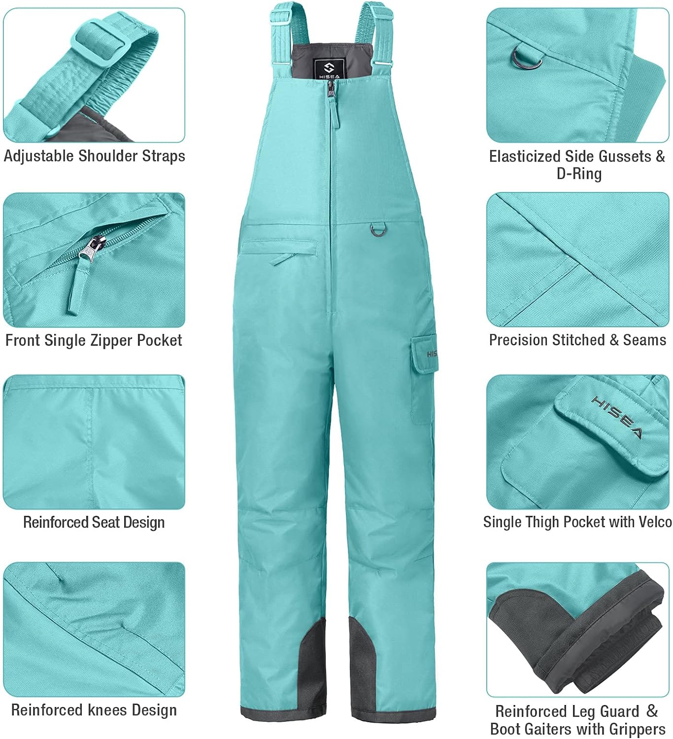 Water & Wind Resistant : HISEA kids snow bibs with a high level of water & wind resistance and breathability, WP/WR 5000mm & MP 3000g/㎡/24h-Water resistant/breathable grade. It is an excellent equipment for children's snow sports, hiking, mountaineering, camping, biking, and other winter outdoor activities.