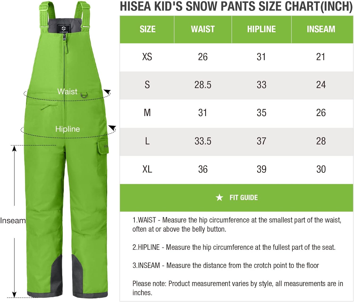 Water & Wind Resistant : HISEA kids snow bibs with a high level of water & wind resistance and breathability, WP/WR 5000mm & MP 3000g/㎡/24h-Water resistant/breathable grade. It is an excellent equipment for children's snow sports, hiking, mountaineering, camping, biking, and other winter outdoor activities.