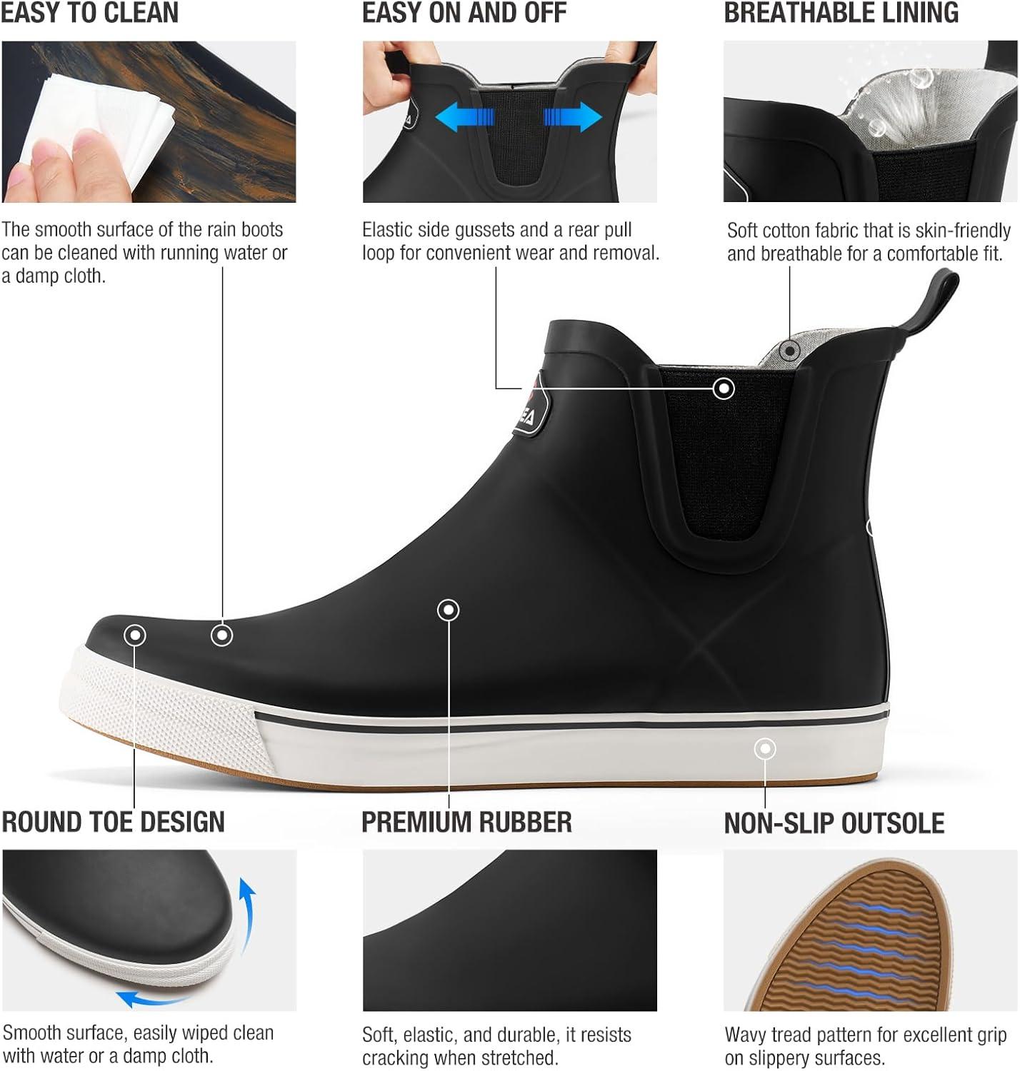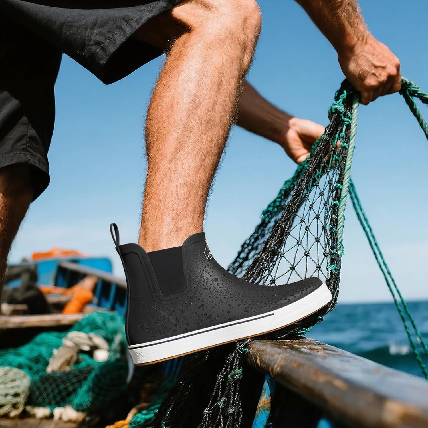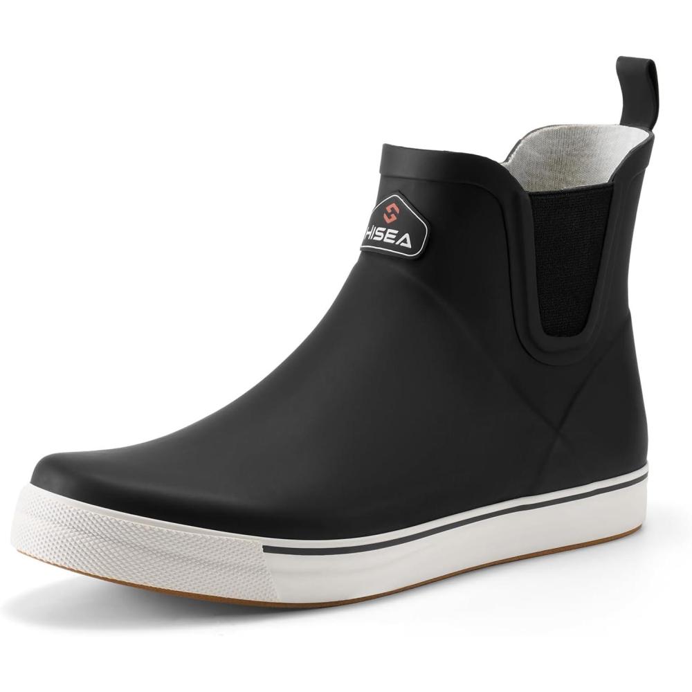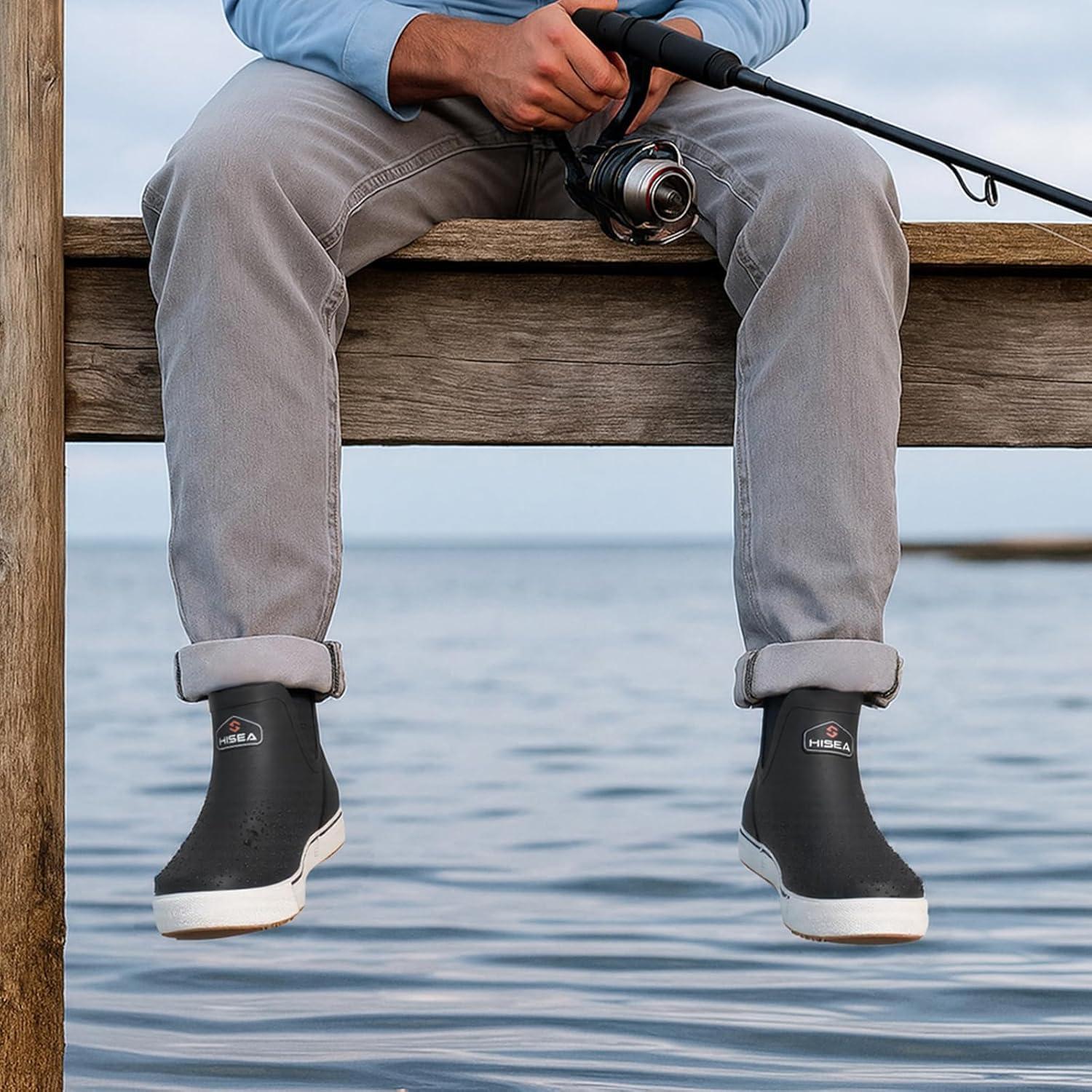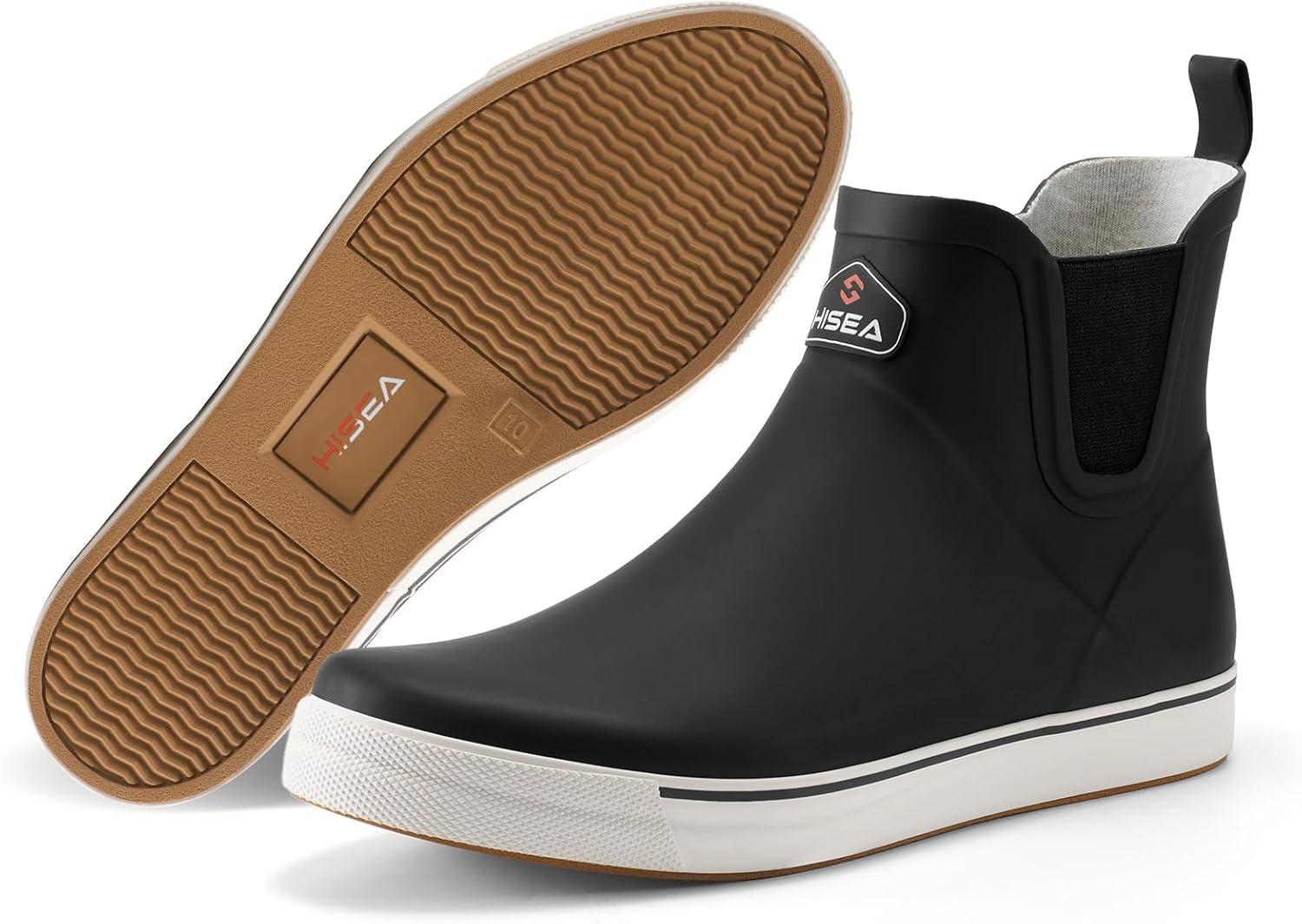 HISEA Men’s Deck Boots Ankle Rain Boots Waterproof Rubber Saltwater Fishing Boot for Sailing(Black)