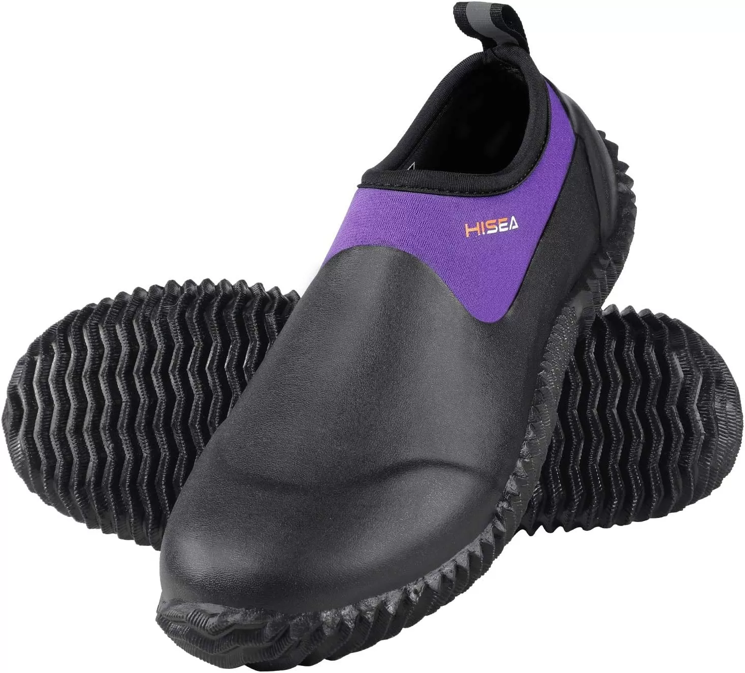 HISEA Unisex Waterproof Garden Shoes, Men’s Ankle Rain Boots Women’s Slip-On Footwear Rain Shoe Rubber Neoprene Outdoor Booties for Gardening, Farming, Camping, Car Wash, Lawn Care and Yard Work, Size M6/W7 Purple