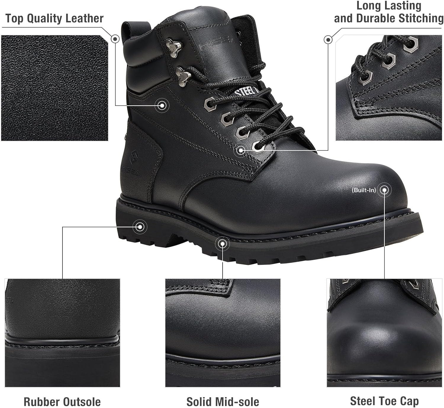 HISEA Work Boots For Men 6 inch Soft/Steel Toe Leather Boots Round-Toe Safety Slip Resistant Construction Work Boots(Steel Toe-black)